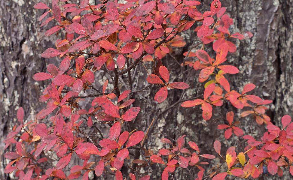 Lehtipuiden lisäksi monien varpu- ja ruohokasvien väritys muuttuu syksyllä. Esimerkiksi mustikanvarvut ovat kauniin punaisia.