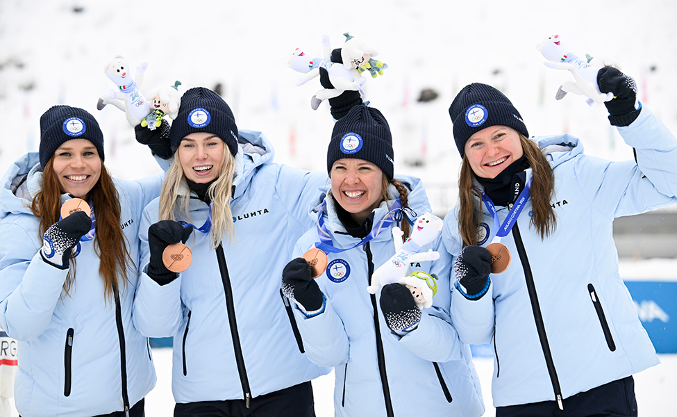 Suomen naisten joukkue voitti olympiapronssia 4 x 7,5 kilometrin viestissä lauantaina. Joukkueessa hiihtivät Johanna Matintalo, Kerttu Niskanen, Vilma Ryytty ja Jasmi Joensuu. Olympialaisten hiihtokilpailut järjestetään Val di Fiemmessä.