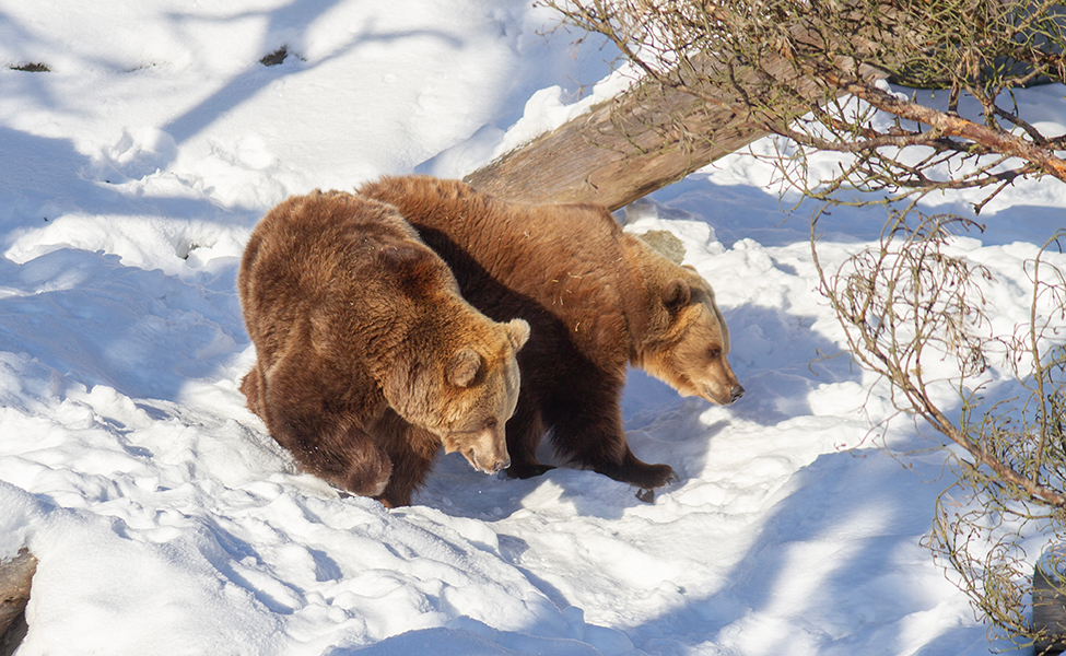 Karhut ovat talven jälkeen edelleen väsyneitä. Ne viettävät vielä suurimman osan päivästä lepäillen pesässään. Karhut pääsevät kuitenkin joka päivä myös ulkoilemaan ja tutkimaan tarhaa, jossa on lunta. Karhut kiehnäävät talviturkkejaan puiden runkoihin, kierivät lumessa ja nuuhkivat tuoksuja lumen alta.